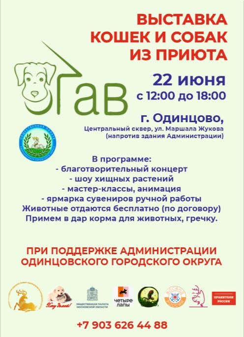 22 июня в Центральном сквере города Одинцово состоится выставка кошек и собак из приютов «Хочу домой!». Мероприятие проводится под эгидой Комиссии по экологии, природопользованию и сохранению лесов Общественной палаты Московской области, Московского областного отделения Всероссийского Общества Охраны Природы, РОД «Хранители России» при поддержке Администрации Одинцовского городского округа.