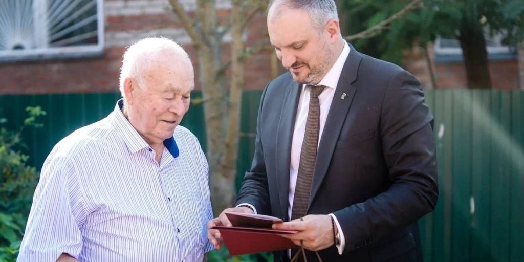 Глава округа Михаил Шувалов поздравил Владимира Андреевича, вручил подарки и, конечно же, пожелал долгих лет жизни.
