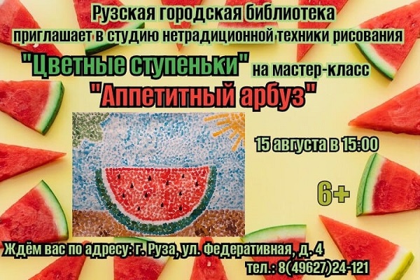 Рузская городская библиотека приглашает детей от 6 лет в студию нетрадиционной техники рисования «Цветные ступеньки» на мастер-класс «Аппетитный арбуз». Он состоится 15 августа в 15 часов.