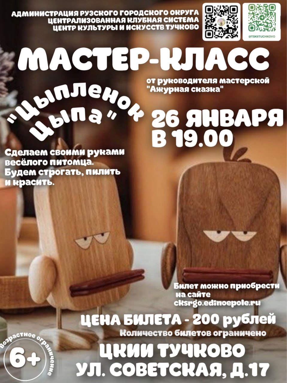 В Тучковском центре культуры и искусств Рузского городского округа 26 января состоится мастер-класс «Цыпленок Цыпа».