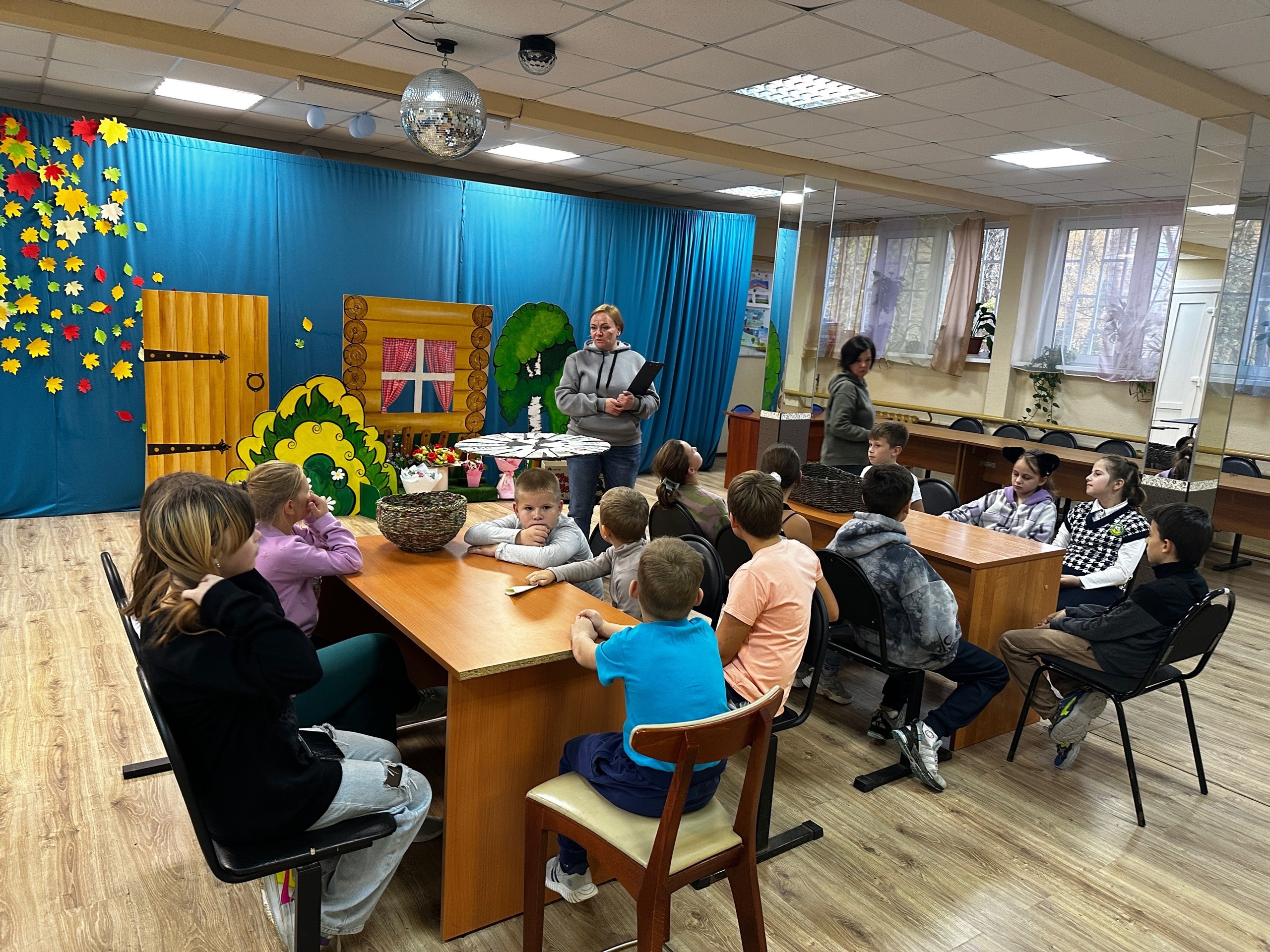 Дети разделились на две команды знатоков и приступили к заданиям. В первом туре игроки, поочередно подходя к барабану, получали вопрос для своей команды, на обсуждение которого предоставлялась одна минута.