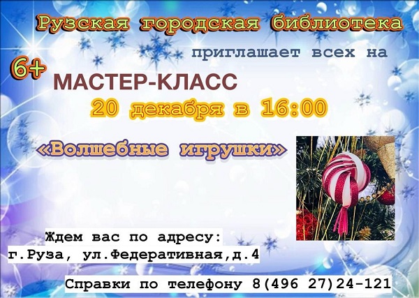 20 декабря в 16 часов в Рузской городской библиотеке состоится новогодний мастер-класс «Волшебные игрушки».