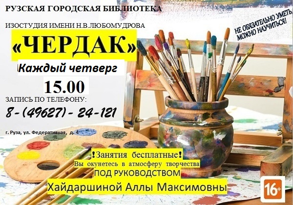 В Рузской городской библиотеке 18 апреля в 15 часов состоится занятие в изостудии имени Н.В. Любомудрова «Чердак» под руководством А.М. Хайдаршиной.