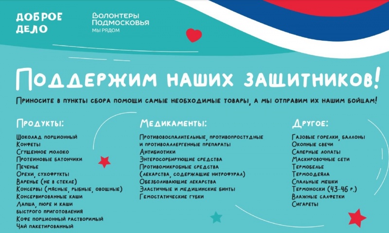 В Подмосковье 12 февраля пройдет День сбора помощи. Любой желающий в воскресенье может присоединиться к проекту «Доброе дело», который проходит при поддержке губернатора, и передать помощь для участников СВО. Единый день сбора помощи 12 февраля, адрес пунктов: - г.Орехово-Зуево, ул.Набережная, д.10б — «Молодежный клуб», 10:00-19:00; - г. Орехово-Зуево — ТЦ Орех, 15:00-19:30. Что можно принести? Продукты: шоколад порционный, конфеты, сгущенку, протеиновые батончики, печенье, орехи, сухофрукты, варенье (не в стекле), консервы (мясные, рыбные, овощные), каши консервированные или быстрого приготовления, лапшу, пюре, порционный растворимый кофе, пакетированный чай. Медикаменты: противовоспалительные, противопростудные и противоаллергенные препараты, антибиотики, энтеросорбирующие и противомикробные средства (содержащие нитрофурал), обезболивающие лекарства, эластичные и медицинские бинты, гемостатические губки. Также можно передать нашим бойцам газовые горелки с баллонами, окопные свечи, саперные лопаты, маскировочные сети, термобелье, термоноски (43-46 размеров), термоодеяла, спальные мешки, влажные салфетки, сигареты.