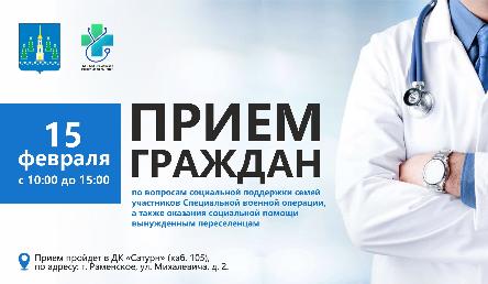 В соответствии с утвержденным Губернатором Московской области графиком 15 февраля 2023 года с 10:00 до 15:00 состоится личный прием граждан по вопросам социальной поддержки семей участников Специальной военной операции,