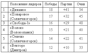 Центральным матчем предпоследнего тура первенства Клина была игра между «Волоком» и «Слободой-1». Волоколамцы победили в пяти партиях – 3:2 (17:25, 25:23, 15:25, 25:20, 15:13). В остальных встречах преимущество одного соперника над другим было более очевидным: «Вектор» — «Динамо» 1:3 (25:21, 21:25, 19:25, 20:25); «Спас-Заулок» — «Поварово» 0:3 (19:25, 18:25, 17:25); «50+» — «Высоковск» 0:3 (17:25, 12:25, 20:25); «СВ» — «Сенеж» 0:3 (21:25, 24:26, 9:25); «Викинг» — «Слобода-2» 3:1 (15:25, 25:21, 25:20, 25:18). Четверка сильнейших команд, которая продолжит борьбу за звание чемпиона, практически сформирована. «Сенеж» еще может обойти «Волок», но вероятность этого мала.