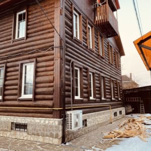 Дом 8,5 х12 м , цоколь - бетон, камень, тёплый пол; далее бревно, мансарда утеплена ППУ закрытоячеистым .