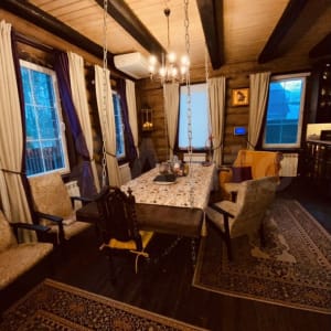 Второй этаж: кухня, столовая, санузел( ванна и туалет) гостиная, спальня для гостей.