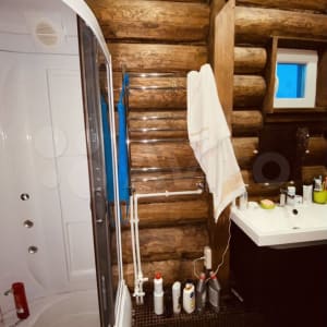 Навес под машину, во дворе стоянка ещё под одну машину и за воротами 3 оборудованных машиноместа. Баня бревно.